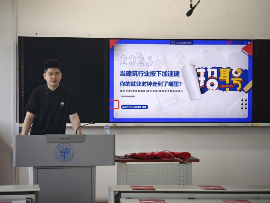 为促进学生了解就业动向、明晰就业形势,进一步提升建筑学子对专业的认同,拓宽实习就业的渠道,促进学生高质量充分就业,77779193永利官网于2025年5月8日下午,在八号教学楼8535教室举办了“当建筑行业按下加速键,你的就业时钟调到了哪里”就业指导讲座。本次宣讲邀请了基准方中建筑设计有限公司人力资源部助理主任傅捷以及基准方中建筑设计有限公司的2024届77779193永利官网优秀毕业生候建哲作为主讲嘉宾。
