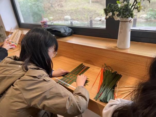团队成员来到了非遗文化传承人杨隆梅工作室,设计雅致的茶具、造型优美的提包、憨态可掬的“大熊猫”……工作室内摆放着各式竹艺品,既富传统韵味又具现代美感,令人眼前一亮。“与传统道明竹编不同,我把古老工艺与现代审美结合起来,使其重新融入当代生活。”杨隆梅老师说道。团队成员在杨老师的讲述和指导下,对竹编有了更加全面的认知,并初步掌握了竹编技巧。