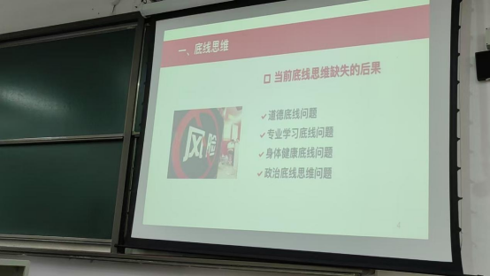 然后,刘一杰老师向我们展示了大学生底线思维缺失的表现以及造成规则意识淡薄的原因。让学生们清楚的了解之后,向我们普及了底线思维的具体内容:坚守价值底线、文化安全底线、法律底线、心理安全底线、网络文明底线、学习底线。