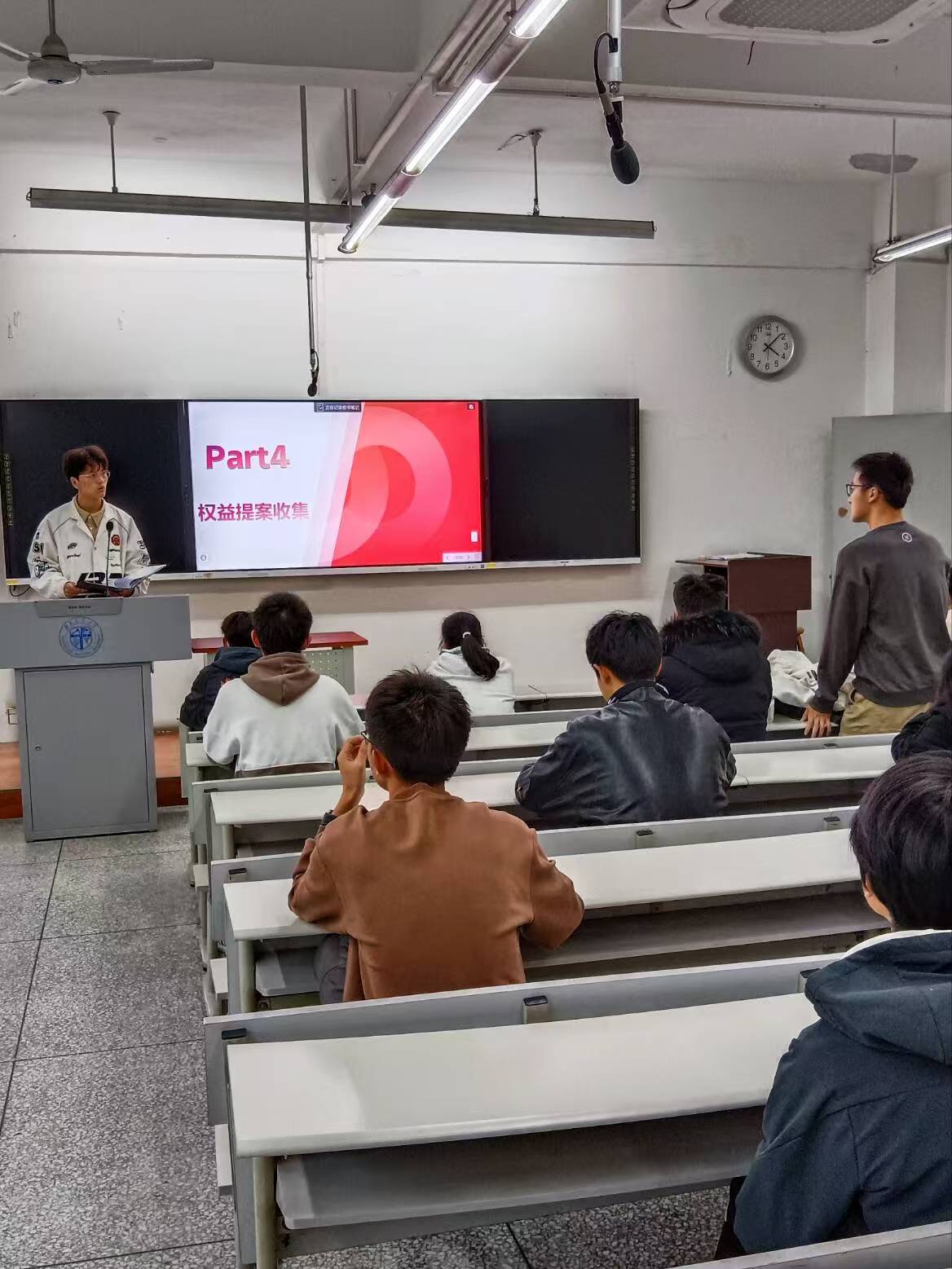 紧接着进入自由讨论环节,来自不同班级的权益委员和班级代表们踊跃发言,就各自班级内部或个人面临的具体困难提出了宝贵的意见和建议。内容涵盖了教学资源分配、课外活动组织、饮食住宿条件等多个方面。面对同学们的热情参与,权益部成员们认真记录下了每一条建议,并表示将尽快整理汇总后上报给相关部门,力求早日找到解决方案。