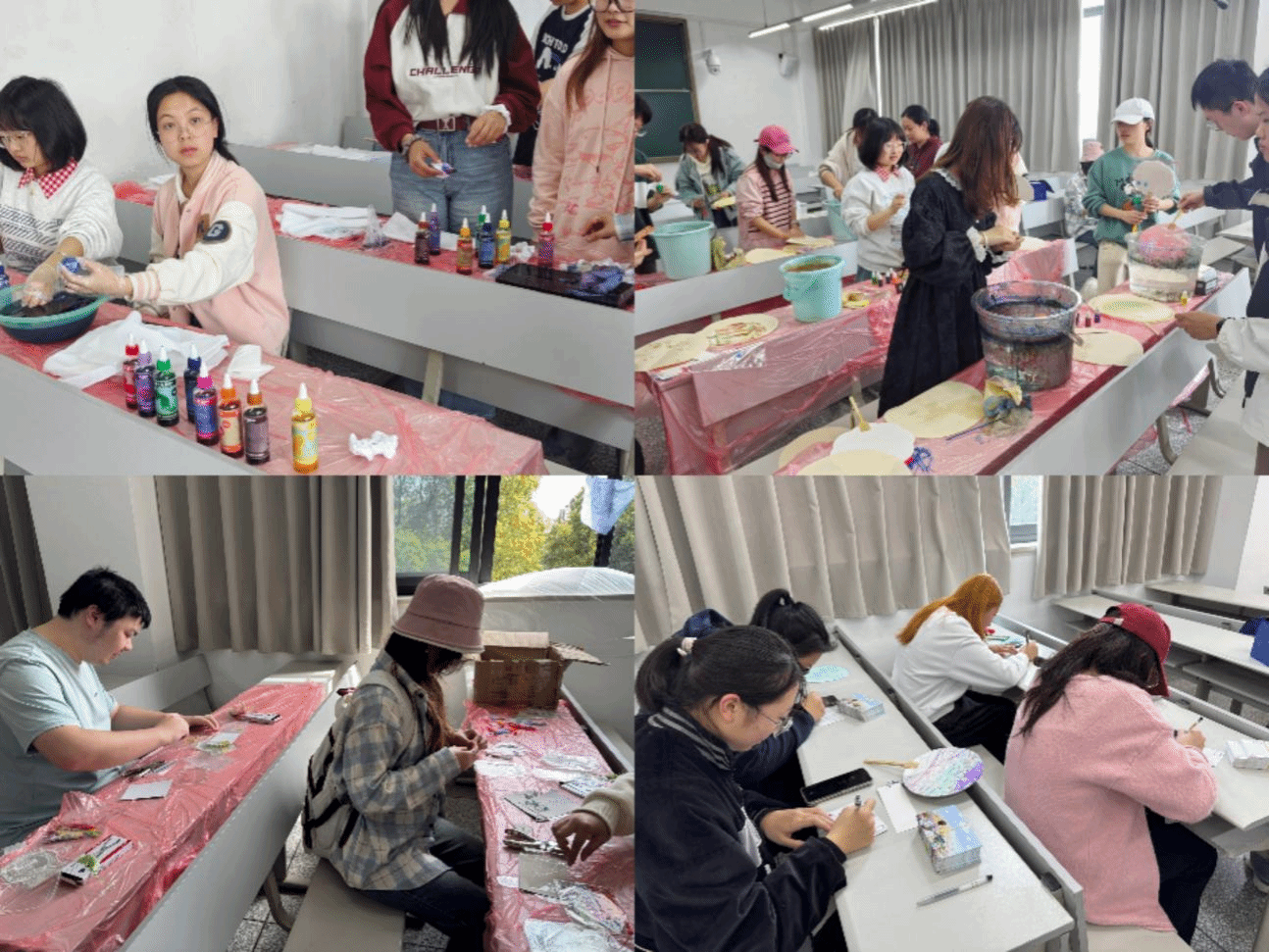 活动现场分为手工艺品制作区与明信片书写区。在志愿者的引导下,参与者们体验了扎染、漆扇、干花书签等传统工艺品的制作。扎染区中,白棉布通过折叠与染色焕发独特纹样;漆扇区里,同学们赋予素扇灵动生机;干花书签制作则让自然之美定格于方寸之间。此外,许多同学在明信片上写下暖心寄语,鼓励山区儿童勇敢追梦。
