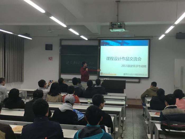 2015年12月2日晚8点,由我院研究生会主办、2015级建筑学专硕班承办的“课程设计作品交流会”在建筑馆8521顺利举行。这次活动的主要目的是让同学们通过此次国际竞赛作品交流,发现彼此间设计上的知识欠缺和经验不足,为以后的建筑设计学习提供专业上的帮助。