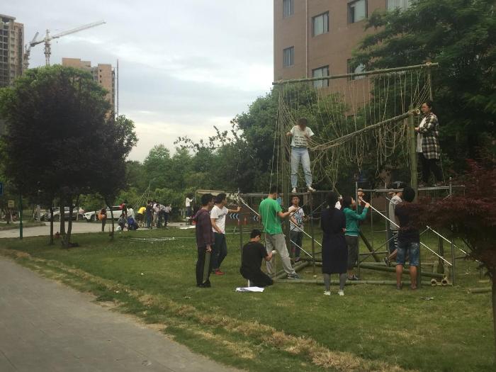 西南民族大学别具一格的选择了木头作为主材料,而成都理工大学的同学们则已经将作品完成大半,并搬至室外进行一些加工,他们将多变而柔软的绳索与坚硬挺直的竹子结合在一起,别具韵味。