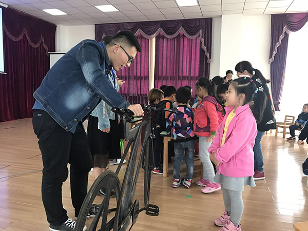 气氛正好,这时候主持人播放了一首有关交通工具的儿歌,并带领大家一起边唱边巩固这在节短课上所学习到的单词。活动进行到尾声,研究生会还准备了学院工业设计专业同学制作的两个跑车模型和一辆造型新奇的等比自行车模型,供小朋友们近距离观察触摸。小朋友们对这突如其来的环节感到十分开心,并且在老师的带领下有序地亲身体验了这三个模型。最后,活动在小朋友们热烈的掌声和稚嫩清脆的再见声中圆满落幕。
