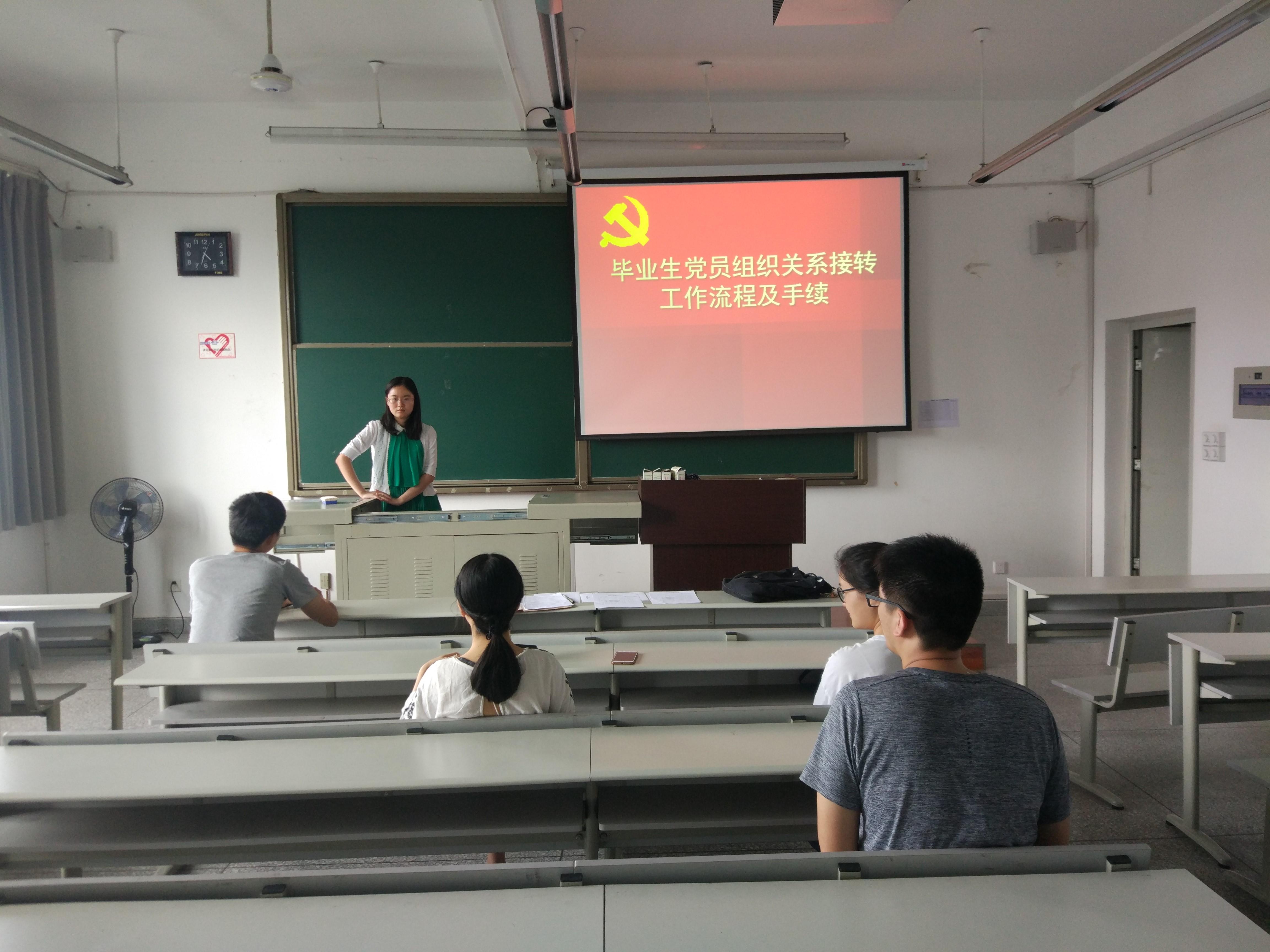 活动由支部书记汤婧同志主持,支部党员和预备党员参加。此次会议是在支部成员临近毕业的情况下,对于党员毕业生党组织关系的各项问题进行统一地讲解和学习。