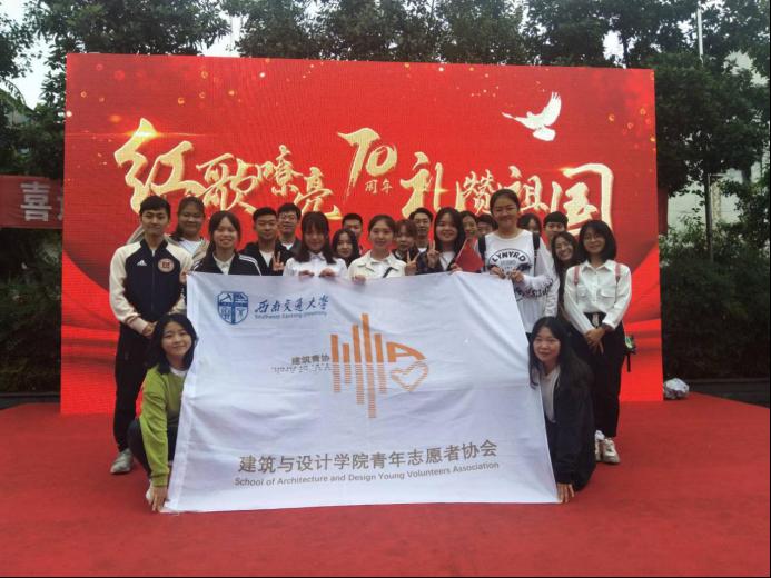 2019年9月15日,为庆祝中华人民共和国成立70周年,加强学生组织与基层党组织的联系,积极践行社会主义核心价值观,西南交通大学建筑与设计学院青年志愿者协会参加了由成都市郫筒街道中心村村委会承办的主题为《红歌嘹亮,礼赞祖国》的文艺汇演。