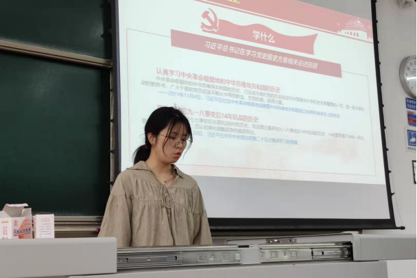 首先,李聪同志分别从“为何学”、“学什么”、“怎么学”三个方面讲述了习近平总书记在学习党史国史方面相关论述。中国共产党的历史是中国近代史上可歌可泣的壮丽篇章,是推进各项工作和事业开展的必修课,我们不但要学,还要好好学。了解我们党领导人民进行艰苦卓绝的斗争历程,是为了让我们以史为鉴,是为了让我们吸取历史教训,不管在任何曲折和困难中,我们都要向我们的先辈那样,不忘初心,砥砺前行。作为新时代的青年,我们要了解党和国家历史上的重大事件及重要人物,我们要学习他们的不怕困难,为人民谋出路和幸福的伟大精神,我们要坚持运用唯物史观全面、客观、历史、辩证的去看待历史。我们要了解屈辱,是为了吸取教训更好的前进,我们要学习正能量,时刻保持高昂的斗志去建设我们富强民主文明和谐美丽的社会主义强国。