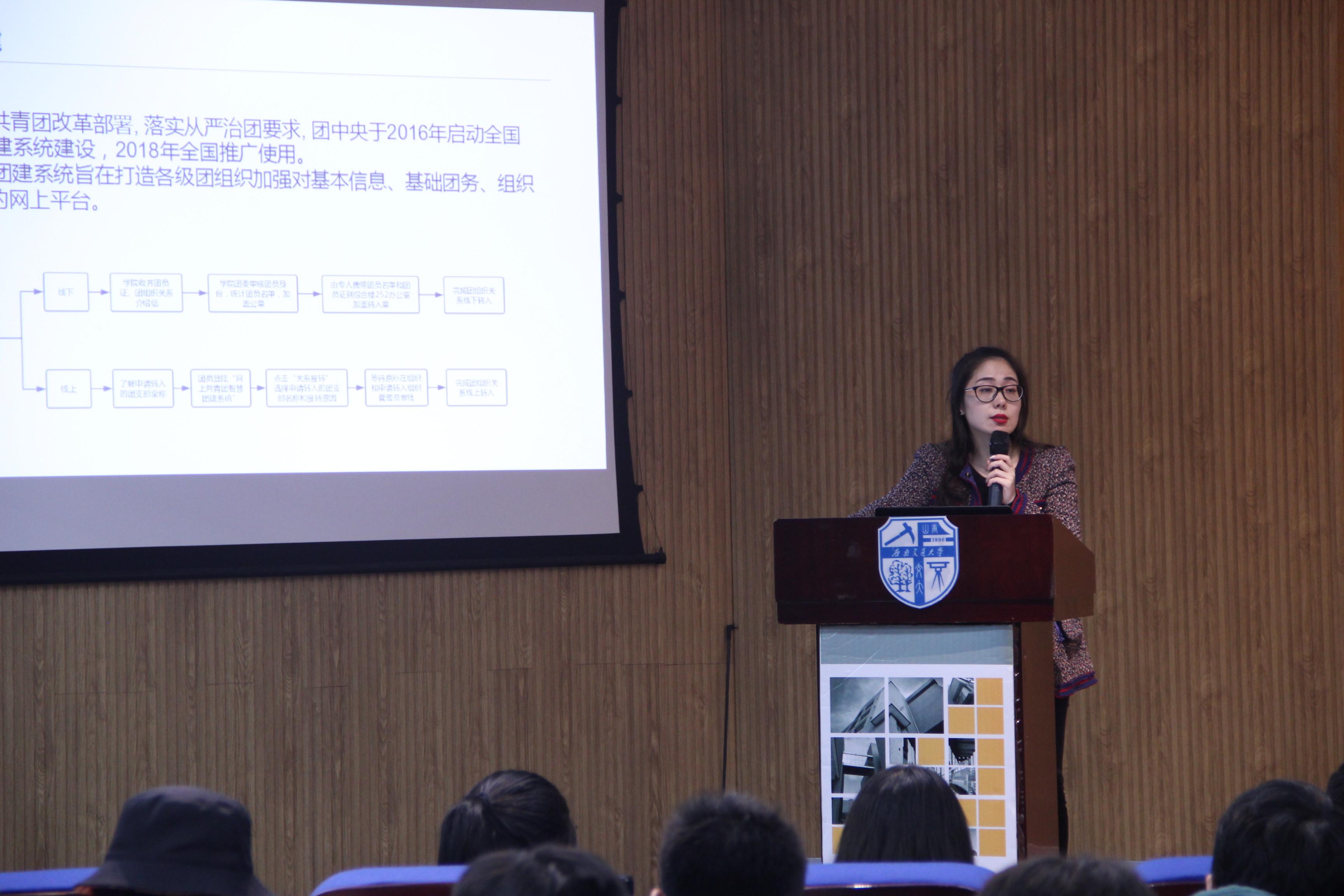 10月31日晚19时30分,为深入贯彻落实习近平总书记关于青年工作的重要思想指导,进一步强化新生思想政治教育,我院在建筑与设计馆300报告厅开展了“不忘初心,牢记使命”新生系列主题教育活动——新生第一堂团课,由我院团委书记,西南交通大学青年讲师团成员孔翔榆老师担任主讲。本次课程也是我院“青马工程”专题教育活动的重要一环。学院辅导员周冶主持,2019级全体新生参加活动。