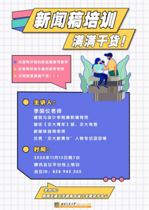 为提升我院学生新闻稿知识水平和写作能力,增强综合素养,充实同学们的课余生活,2020年11月13日晚19时,西南交通大学建筑与设计学院团学中心通过腾讯会议平台举办了“校园新闻稿写作”线上培训活动。本次培训由团学中心主任吕薇主持,建筑与设计学院辅导员李国仪老师担任主讲人,共计191人参与此次培训学习。