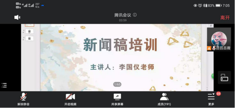 经过线上签到后,本次培训正式开始。首先,李国仪老师对新闻的概念、定义以及分类等进行简明阐述,通过逐点分析的方法,对新闻稿的标题、导语、正文、结尾、落款等五部分的写作技巧进行细致分析。讲解过程中,李老师列举了大量生动有趣且贴合主题的案例,帮助同学们更好的理解和接受知识。