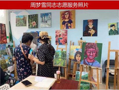 周梦雪同志暑假期间完成了三次志愿活动,印象最深刻的是青羊区残疾人活动中心的特殊儿童陪伴绘画活动。周梦雪同学满怀情感地介绍了这次志愿经历:“这一群儿童有的是唐氏综合症、有的是自闭症儿童等……他们都有共同的爱好就是绘画,在画室里挂着这群孩子画的画作,有的甚至比一般人画的还好,这群孩子热情、善良,还为我们志愿者们跳手指舞,唱歌,亲切的叫我们哥哥姐姐。一下午的陪伴我试着了解负责的这个儿童,虽然他说话说不清楚,但是他用画笔画出了他内心的童真世界,有海、有沙滩、还有椰子树……承载着他内心的美丽世界,也在守护着小朋友内心的童话。”最后,她补充道:“通过这次活动我更加了解这群特殊儿童,也希望社会上的大家可以多给他们一些耐心和关注,他们和我们每个人一样,真诚而又热切得生活着。”