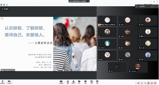 为了使同学们更加关注心理健康,了解抑郁症患者的内心独白,善待他人,并正确认识抑郁情绪,积极面对生活。西南交通大学建筑与设计学院2019级建筑学学硕班于2021年11月18日晚20时,开展了以“认识抑郁、了解抑郁,善待自己、关爱他人”为主题的班级活动,鉴于目前疫情防控相关规定,此次活动在线上通过腾讯会议开展,由班级心理委员罗铮蒸和班长刘肖共同负责组织。