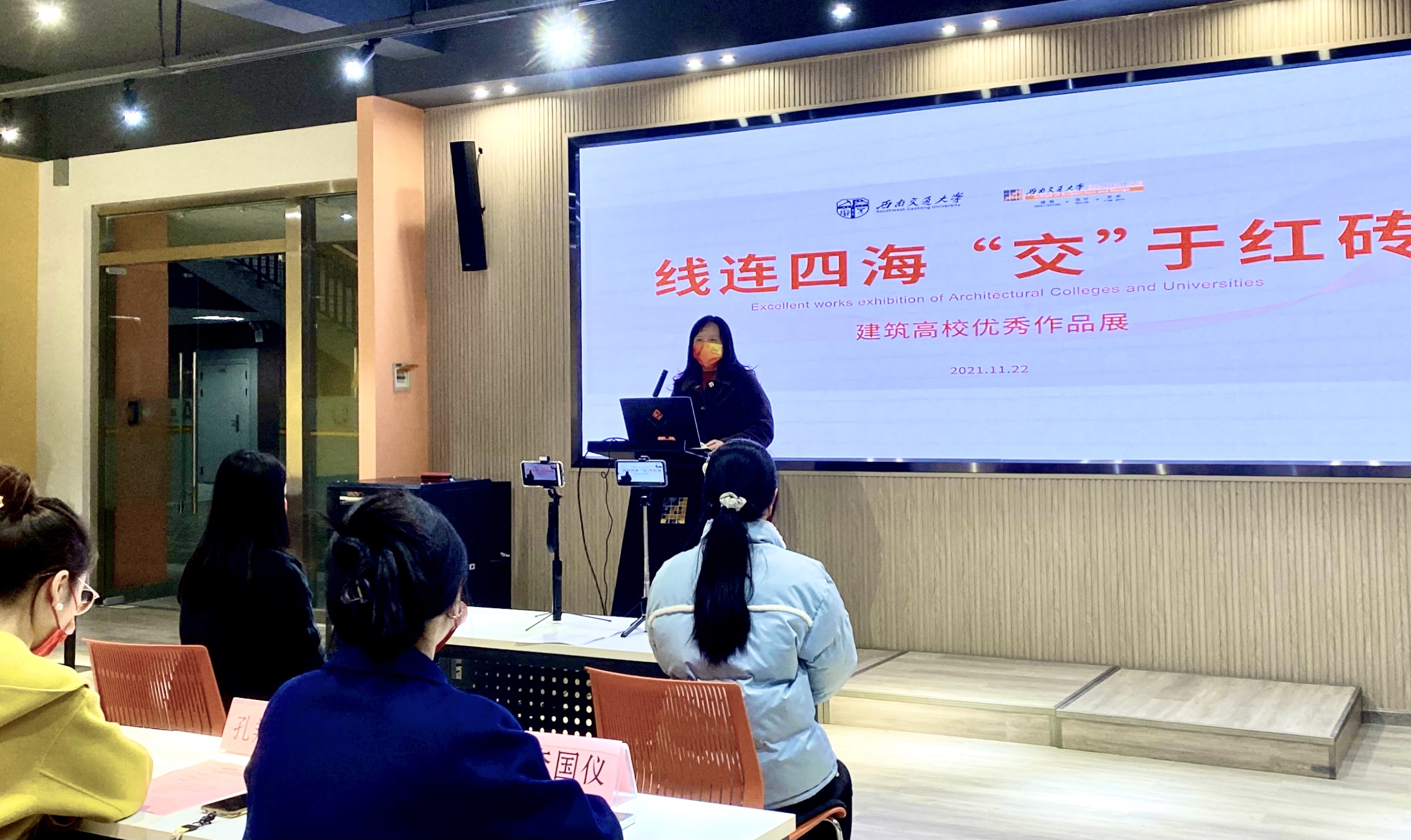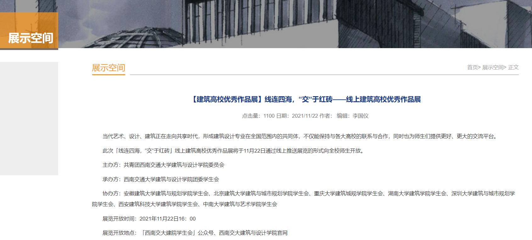 2021年11月22日,线连四海,“交”于红砖——建筑高校优秀作品线上展在西南交通大学建筑与设计学院D100报告厅隆重开幕,约300名对建筑专业饱含热情的全国各大建筑高校的同学通过线上腾讯会议的方式参加了开幕式。