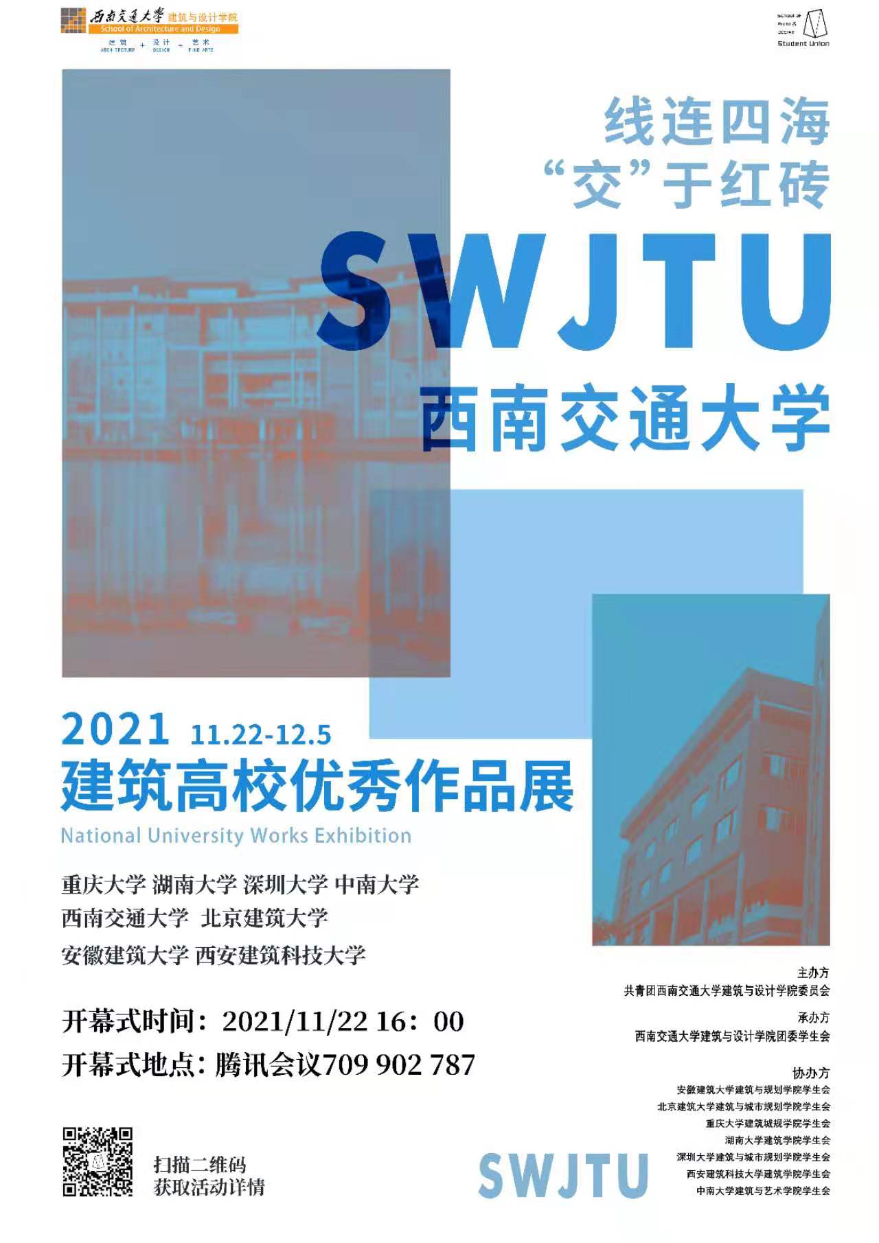 此次活动由共青团西南交通大学建筑与设计学院团委会主办,西南交通大学建筑与设计学院团委学生会承办,安徽建筑大学建筑与规划学院学生会、北京建筑大学建筑与城市规划学院学生会、重庆大学建筑规划学院学生会、湖南大学77779193永利官网学生会、深圳大学建筑与城市规划学院学生会、西安建筑科技大学77779193永利官网学生会、中南大学建筑与艺术学院学生会协办。活动旨在以展览为契机,加强美育教育,为全校同学提供更丰富的资源,真正促进学生专业能力和综合素质的进一步提升,强化高校间的合作交流,传递交大精神和建筑与设计学院特色。