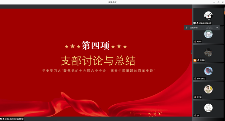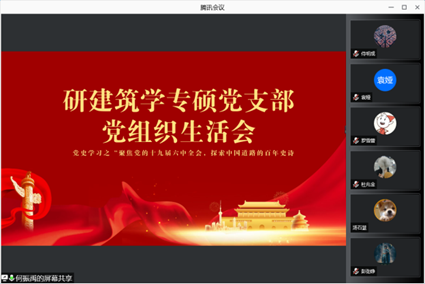2021年11月11日19:00时,西南交通大学研建筑学专硕党支部于腾讯会议线上召开 “聚焦党的十九届六中全会,探索中国道路的百年史诗”主题组织生活会,支部全体党员及入党积极分子参加了本次会议。本次会议由何振禹同志主持。