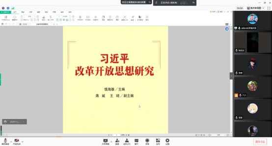 新时代改革开放思想,是习近平新时代中国特色社会主义思想的重要组成部分,是中国特色社会主义理论体系新的思想瑰宝,是马克思主义中国化的成果,是推进我国改革开放各项事业必须长期坚持的重要指导方针和根本行动指南。受疫情影响,2021年11月11日,研风景园林党支部通过腾讯视频形式开展了“学习《习近平改革开放思想研究》及感悟分享”生活会,本次生活会邀请了建筑与设计学院辅导员赵思琦老师和戎尚老师,本次会议由赵秋吉同志和起雨涵同志共同主持。