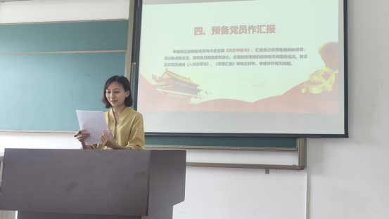 本次会议由博士党支部书记刘冲同志主持,支部与会的中共正式党员13名。会议伊始,首先由支部书记刘冲同志清点到会党员人数,并宣布会议开始及大会议题,与会党员举手表决一致通过并确定本次转正大会的计票人和监票人为杨仙同志和谢易兵同志。其次,马杰茜同志向大会宣读《转正申请书》,并对自身预备期一年内自己的思想、学习、生活等情况做出了总结,并正确的认识了自己的缺点与不足,表明成为一名正式党员后,将不断地改善自身、提升自我。入党介绍人罗克乾、梁朋朋两位同志分别汇报马杰茜同志在预备期间的表现情况,杨仙同志代表支部委员会介绍马杰茜同志在预备期间的教育和考察情况,并宣读转为正式党员的意见。最后,支部大会讨论马杰茜同志在预备期的表现,肯定成绩,指出不足,提出希望,并采用无记名投票的方式,一致同意马杰茜同志按期转为中共正式党员。本次支部会议气氛轻松、和谐,充分体现了党内的民主性,增强了党内同志的交流。