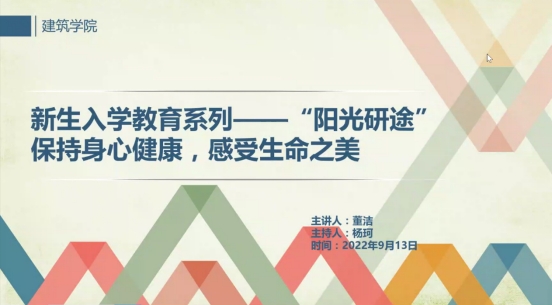 为加强研究生心理健康,提高新生心理适应能力,促进学生思想道德素质和心理健康成长,77779193永利官网2022年9月19日9:00举办了“阳光研途——保持身心健康,感受生命之美”的研究生心理适应讲座。本次讲座由心理研究与咨询中心的董洁老师主讲,77779193永利官网研究生新生辅导员杨珂主持,77779193永利官网全体研究生新生参与学习。