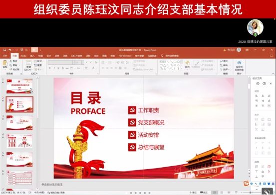 接着,组织委员陈珏汶向各位新生党员及积极分子从党支部工作职责、成员组成、支部组织生活以及工作期望四个方面介绍支部基本情况,加深新生党员对支部日常活动的了解。陈珏汶同志表示,希望新生党员能够吸收和借鉴以往经验并尽快融入到新的学习生活中,并欢迎研一党员同志们随时交流学习,共建更加优秀的党支部。随后,为帮助新生党员更好熟悉支部建设及积极分子培养考察工作,韩瑞从入党积极分子考评积分制度、积极分子培养考察工作、发展对象推优几个方面详细介绍了培养流程。