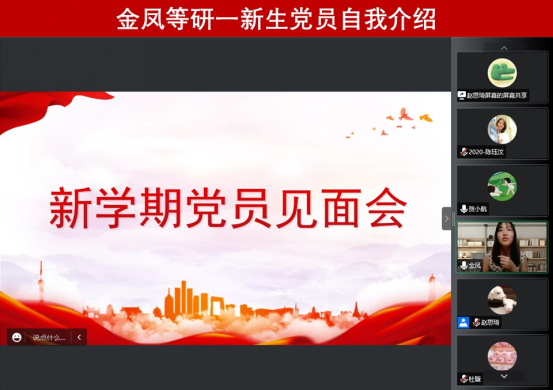 本次会议围绕三个议题展开。议题一是新学期党员见面会。首先,党支部书记赵思琦对新生党员同志们的加入表示热烈的欢迎,向新生党员们介绍了党支部的概况,并简单介绍了支委的组成人员,让新生党员对支部的党建工作有了初步的认识,希望各位新生党员牢记党员身份,在今后的学习、生活中积极发挥党员先锋模范带头作用。随之邀请各位新生党员同志向大家做自我介绍,研一党员杜璇、金凤等各位同志表示,非常高兴加入党组织,进入支部后会继续严格要求自己,积极履行党员职责。