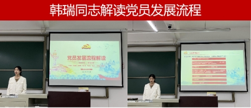 会议伊始,韩瑞同志为大家详细介绍了从入党积极分子到正式党员的全部流程,以及相关注意事项,围绕对应阶段所必要的条件进行详细阐述。并强调到,入党要严格遵循流程,正确认识党的性质,端正入党动机,不光要扣好“人生的第一颗纽扣”,也要扣好“入党的第一颗纽扣”,成为一个热爱党和国家的好青年。