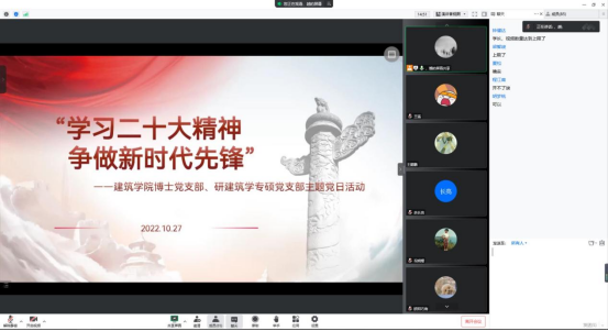 2022年10月27日15时至16时,西南交通大学研建筑学专硕党支部与77779193永利官网博士党支部于腾讯会议线上共同开展“学习二十大精神,争做新时代先锋”主题党日活动暨论文写作交流会。两个支部的党员和积极分子参加了本次会议,本次会议由黄越同志主持。