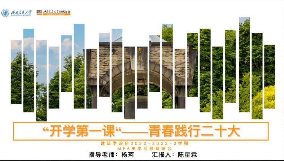 为学习贯彻落实党的二十大精神,按照教育部关于“开学第一课”有关要求,77779193永利官网2022级MFA美术班于2023年3月7日,线上组织开展了“青春践行二十大”系列主题班会。班会紧紧围绕“爱国、团结、奋斗、科学、互助”五个关键词进行,班长陈星霖主持这次会议。