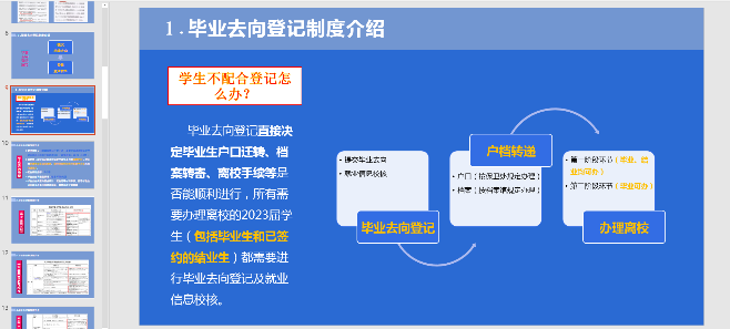 会议开始之初,主持人赵思琦老师从毕业生档案材料归档要求、毕业生档案转递信息校核,档案单位填写说明、档案转递及查询、相关表格填写要点及规范等多个方面进行说明,强调了档案的重要性,提醒大家重视档案问题。接着从毕业生工作要求及近期有关工作安排、毕业去向登记制度及就业信息校核、毕业生离校系统介绍三个方面为同学们讲解了毕业需要处理的各项事项,并提醒同学们尽快将手中的三方材料交到办公室。最后,同学们针对自身疑惑提出问题,赵思琦老师耐心认真为同学们解答并强调档案转递等事关重要,应认真对待。