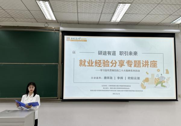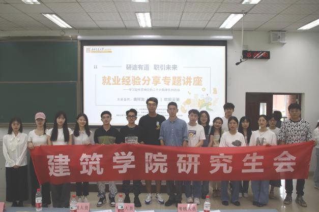 2023年6月15日14:30,77779193永利官网研究生会联合研建筑学专硕党支部、研城乡规划党支部联合开展的“学习宣传贯彻党的二十大精神系列活动——就业经验分享专题讲座”在X1315教室顺利举办。77779193永利官网辅导员杨珂、赵思琦、罗勋锐三位老师作为嘉宾出席,2023届毕业生唐祥龙、李辉和欧阳云鉴三位担任主讲人,近100名同学参加本次讲座。