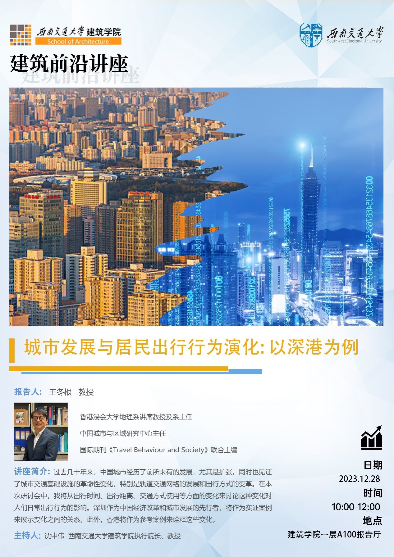 王冬根博士现为香港浸会大学地理系讲席教授及系主任,中国城市与区域研究中心主任。其主要研究兴趣包括交通行为与地理空间;城市社会空间分异与幸福感与健康地理等。王冬根教授是国际期刊《Travel Behaviour and Society》联合主编(2013- );《Journal of Transport Geography》(2013- )、《Transport Reviews》(2021- )等编委、香港交通研究会理事及会士;曾任美国地理学家协会期刊《Annals of the American Association of Geographers》编委 (2014-2017)及香港地理学会会长(2009-2013)。先后主持多项香港研究资助局研究项目及中国国家自然科学基金委项目。他的最新著作发表在主要的交通、地理及城市研究的国际期刊如Annals of the American Association of Geographers; Applied Geography; Transportation Research Part D 及Part A; Housing Studies; Urban Studies; Transport Reviews; Journal of Transport Geography等。