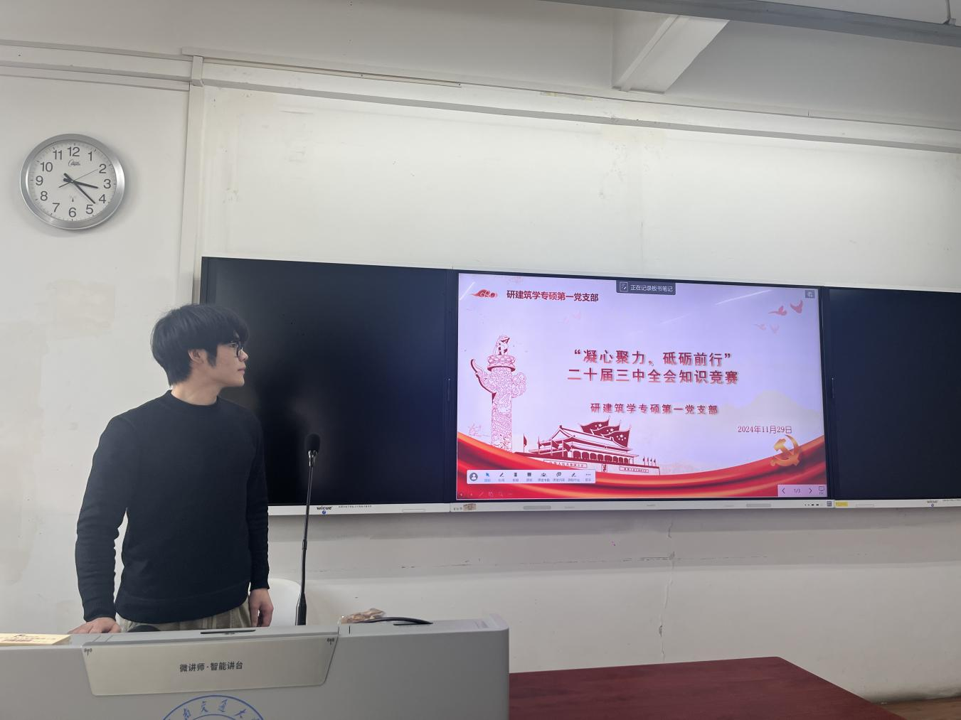 为深入学习贯彻党的二十届三中全会精神,进一步提升研建筑专硕第一党支部全体党员理论水平和政治素养,引导支部党员凝聚思想共识、激发奋进力量,研建筑专硕第一党支部于2024年11月21日16:00,在X8323教室开展了“凝心聚力,砥砺前行”主题党日活动。本次会议由谢纪彤同志主持,研建筑学专硕第一党支部全体党员和积极分子共同参加。