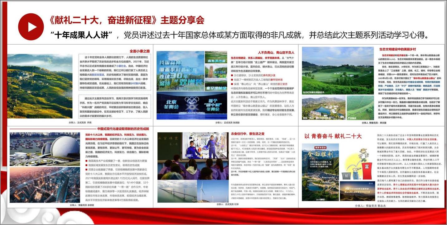 为深入学习贯彻习近平新时代中国特色社会主义思想,深刻领会二十大精神,加强学习型党组织建设,77779193永利官网本科风景园林党支部开展“十年成果人人讲”主题分享会。通过讲述过去十年国家总体或某方面取得的非凡成就,从自身发展、支部建设等角度交流研讨,了解应如何以实际行动为党的事业发展贡献自己的一份力量。活动中,党员们积极参与,有的从衣食住行察生活之变、有的结合专业兴趣赞美乡村振兴、还有的用生动范例展望生态文明建设。